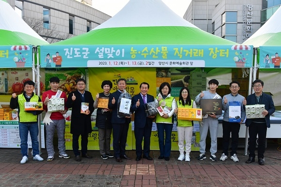 경남 양산시는 12, 13일 양일간 양산문화예술회관 앞 직거래 장터 부스에서 자매도시 진도군의 설맞이 '농·수 특산품 직거래 장터'를 개최했다.