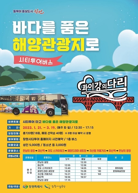 경남 창원시는 시티투어버스를 타고 시내 주요 해양관광지를 둘러보는 특별노선인 '바다를 품은 해양관광지로' 참가자를 모집한다고 16일 밝혔다.