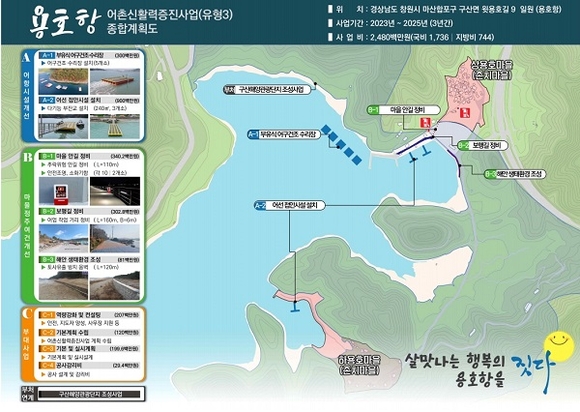 안전인프라 개선사업으로 선정된 용호항은 협소한 어항 진입도로 개선과 어업활동을 위한 기초 인프라 확보를 위하여 마을안길 정비, 어선 접안시설과 부유식 어구건조수리장 설치 등 지역특성에 맞는 어촌·어항시설 개선에 총력을 기울일 계획이다.