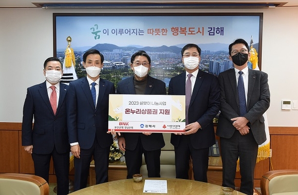 경남 김해시는 19일 BNK금융그룹에서 설을 맞아 어려운 이웃을 위해 써 달라며 2500만원 상당의 온누리상품권을 기탁했다고 밝혔다.