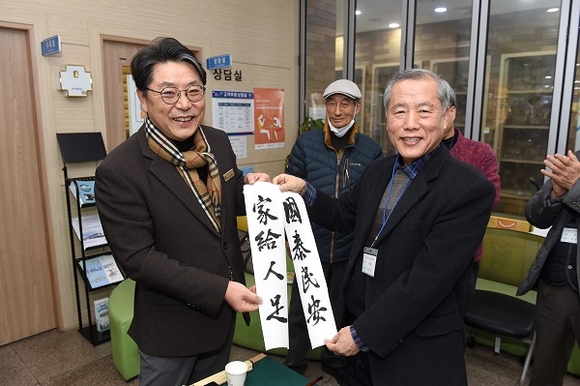 먼저 지난 2일 오후 청사 종합민원실에서 한국서가협회 김해지부 주관으로 민원실 내방객에게 한 해의 건강과 행운을 기원하는 '입춘방'을 무료로 나눠주는 행사를 진행했다. 예로부터 봄의 시작을 알리는 절기인 입춘이 되면 복을 기원하는 글(입춘방)을 써 대문이나 기둥, 천장에 붙이는 풍속이 있다.