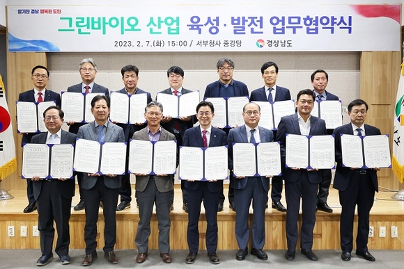 경남도는 7일 서부청사에서 새로운 미래 성장산업으로 주목받는 '그린바이오 산업 육성·발전'을 위해 진주바이오산업진흥원 등 14개 유관기관·기업과 상호 협력 업무협약을 체결했다.