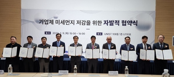 낙동강유역환경청과 울산시는 9일 울산지역의 대기환경관리를 위해 동남권 미세먼지연구·관리센터 및 울산지역 31개 기업과 '미세먼지 저감을 위한 자발적 협약'을 체결했다고 밝혔다.