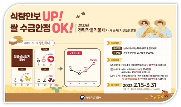 지원 자격은 논 농업에 활용된 농지에서 전략 작물을 재배하는 농업인 및 농업법인이다. 신청 방법은 농지 소재지가 있는 읍면동 행정복지센터에서 오는 15일부터 3월 31일까지 방문 신청하면 된다.