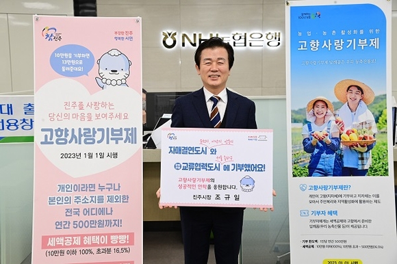 조규일 진주시장은 10일 농협은행 진주시청출장소에서 고향사랑기부제도의 확산과 기부 동참을 위해 마음으로 함께하는 자매결연도시와 문화·관광 교류 협약으로 돈독해진 서울 송파구에 고향사랑기부금을 기탁했다.