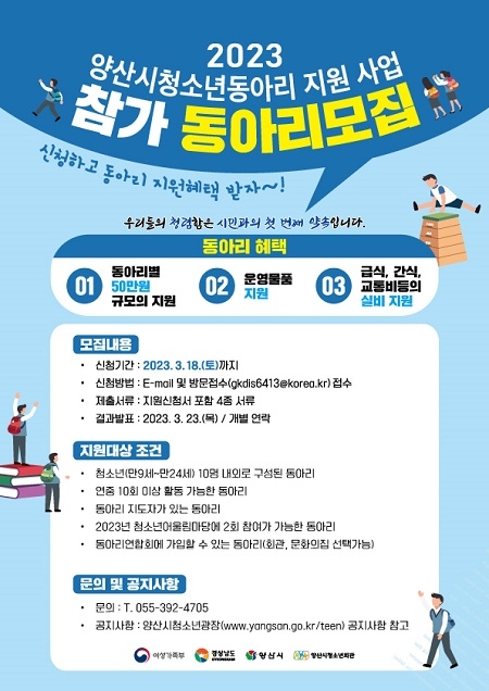 경남 양산시와 양산시청소년회관은 오는 14일부터 청소년동아리의 활성화를 위한 지원사업에 참가할 동아리를 모집한다고 10일 밝혔다.