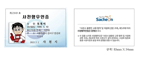 이번 '사천향우인증'은 출향인들의 고향 방문을 유도하고 정서적 유대감과 사천인으로서 자긍심을 고취시키기 위해 발급하는 것.