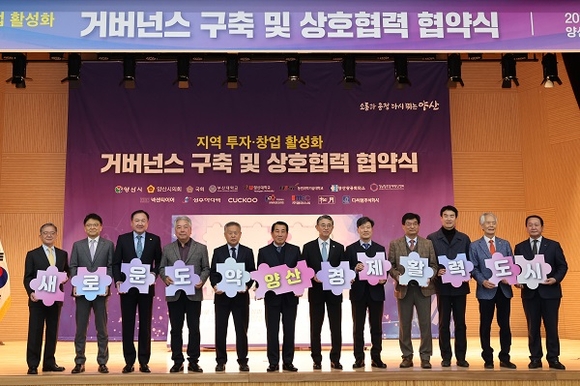 경남 양산시는 27일 양산비즈니스센터에서 지역 내 대표기업 및 대학 등 16개 기관대표와 시민통합위원 등 100여명이 참석한 가운데 '지역 투자·창업 활성화 거버넌스' 구축 및 상호협력 협약식을 가졌다.