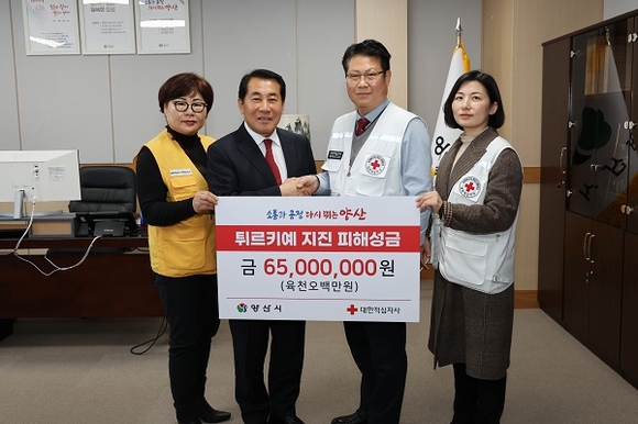 경남 양산시가 강진으로 큰 피해를 입은 튀르키예의 조속한 피해 복구와 안정을 위해 긴급구호성금 6500만원(미화 5만 달러 상당)을 전격 지원키로 하고 지난 3일 대한적십자사에 전달했다.