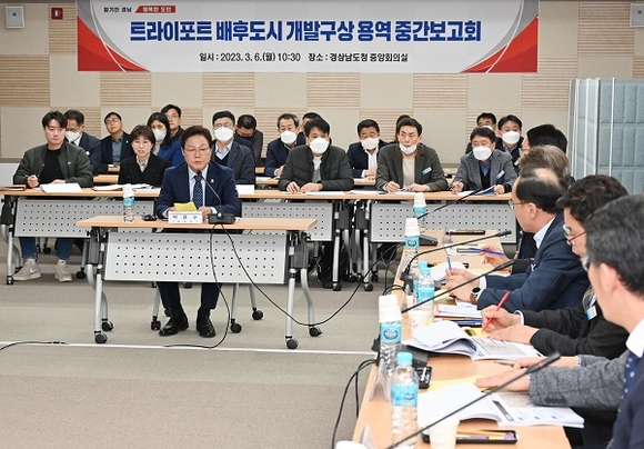 경남도는 6일 도청 중앙회의실에서 박완수 도지사를 비롯한 도 실국장, 창원, 김해, 거제 부시장이 참석한 가운데 '가덕도신공항 배후도시 개발구상 수립용역' 중간보고회를 가졌다.