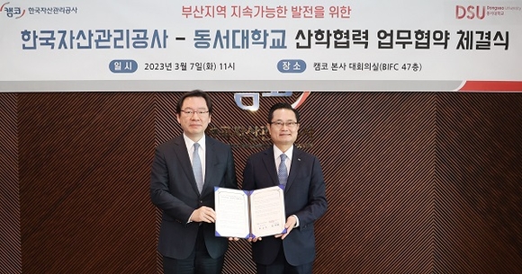 한국자산관리공사(캠코)가 7일 부산국제금융센터(BIFC) 본사 47층 대회의실에서 동서대학교와 ‘부산지역 지속가능한 발전을 위한 산학협력 업무협약’을 체결했다.