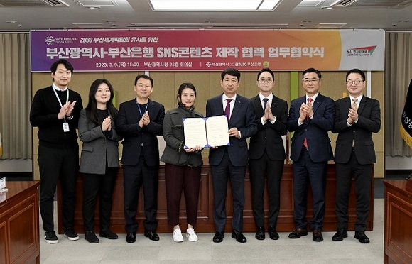 BNK부산은행이 9일 오후 부산시청에서 부산시와 ‘2030 세계박람회 부산유치를 위한 SNS 콘텐츠 제작 업무협약’을 체결했다고 밝혔다.