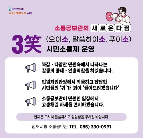 세 번째, 3소(오이소, 말씀하이소, 푸이소) 시민소통제를 새로 도입했다. 문제 해결을 떠나 들어주는 것만으로 시민들의 답답한 속내를 조금이나마 풀어주기 위한 것으로 기획조정실장, 정책특별보좌관, 소통공보관 등 6명이 1민원 1전담제로 분쟁 해결 시까지 부서와 민원인 간 중재역을 맡는다. 민원분쟁의 종착지인 각종 행정쟁송 감소에도 도움이 될 것으로 기대된다.