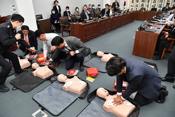 한편 이날 본회의에 앞서 열린 의원 간담회에서는 전체 시의원과 의회사무국 직원을 대상으로 심폐소생술 교육이 진행됐다. 시의회의 요청으로 진주시 보건소와 진주소방서에서 시행한 이번 교육을 통해 의원단 등은 이론과 실습을 겸해 심폐소생술, 자동제세동기(AED) 사용법, 기도폐색 대처법 등을 배웠다.