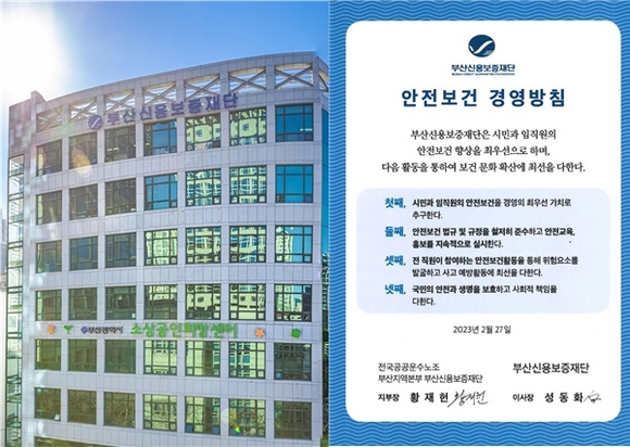 부산신용보증재단이 지난달 27일 본점에서 이사장을 비롯한 임직원이 참여한 가운데 노·사 공동으로 ‘공공부문 안전보건 경영 선제적 추진’에 적극 동참하겠다는 선포식을 가졌다고 밝혔다.