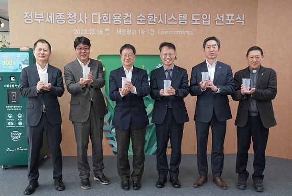 남부발전은 16일 정부세종청사 교육부 내 커피숍에서 행정안전부, 환경부, SK텔레콤 및 재단법인 행복커넥트, 세종충남가톨릭사회복지회와 함께 ‘정부세종청사 제1호 다회용컵 순환시스템 도입을 위한 업무협약’을 체결했다고 밝혔다.
