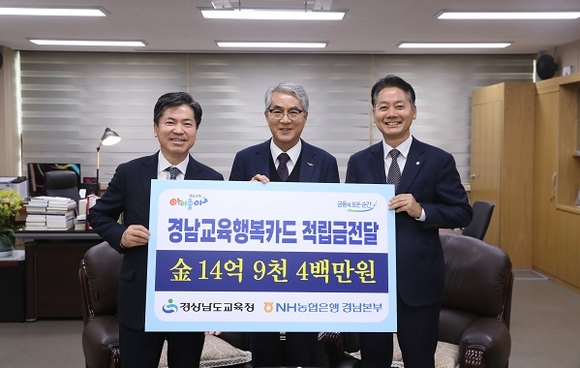 경남도교육청은 20일 NH농협은행이 비씨카드사 제휴카드인 '경남교육행복카드' 사용 포인트 적립금 14억 9434만 840원을 전달했다고 밝혔다.
