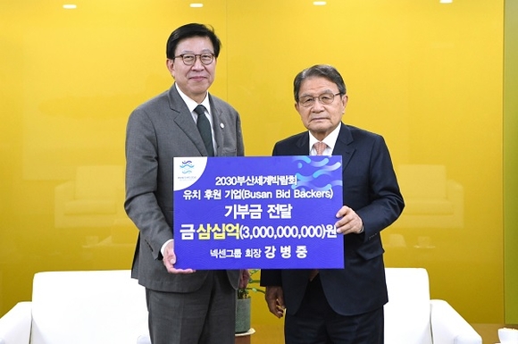 부산시가 22일 오후 5시 시청 의전실에서 넥센그룹 강병중 회장이 2030부산세계박람회 유치를 위한 기부금 30억 원을 전달했다고 밝혔다.