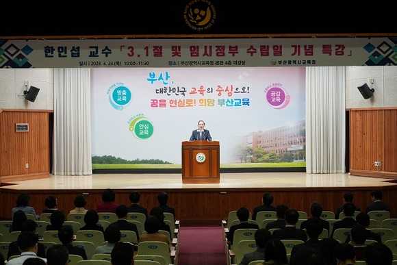 부산시교육청이 23일 오전 10시 시교육청 본관 4층 대강당에서 교육지원청, 직속 기관 직원 등 500여 명이 참석한 가운데 열린 ‘3·1절 및 임시정부 수립일 기념 특강’을 진행했다고 밝혔다.