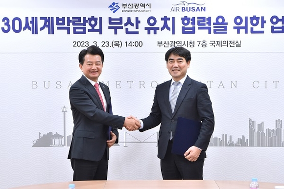 부산시가 23일 오후 2시 시청 국제의전실에서 에어부산과 2030부산세계박람회 유치 협력을 위한 업무협약을 추가로 체결했다고 밝혔다.