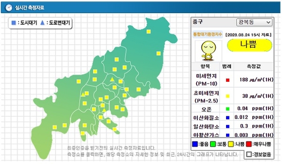 이에 시는 즉각 미세먼지 주의보를 발령한 데 이어 사업장·건설공사장 가동·조업시간을 조정하고 도로 재비산먼지 제거 차량을 확대 운영하는 등 저감조치에 나섰다.
