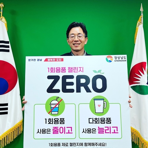 김병규 경남도 경제부지사가 24일 1회용품 사용 줄이기 문화 확산과 정착을 위해 환경부에서 시작한 '1회용품 제로 챌린지'에 동참했다. 김 부지사는 통영시의 지목을 받아 참여하게 됐으며, 다음 실천 운동 주자로 창원시, 한국남동발전, 경상국립대학교를 지목했다. (사진=경남도 제공)