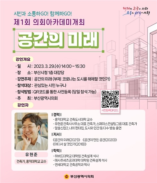 부산시의회가 오는 29일 오후 2시 부산시청 1층 대강당에서 유현준 홍익대 건축도시대학 교수를 초청해 ‘제1회 의회아카데미’를 개최한다고 밝혔다.