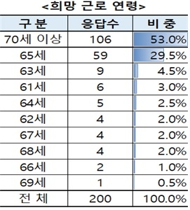 재취업 이후 희망 근로 연령에 대해서는 70세 이상이 53%로 압도적이었으며 65세까지도 29.5%로 많은 비중을 차지하는 등 정년 이후에도 최소 5년 많게는 10년 이상을 일하고자 하는 응답자가 대부분이었다. 최근 기대수명 증가의 흐름 속에서 노후 안정자금인 국민연금 수령시기 등을 고려한 현실이 반영된 것으로 보인다.
