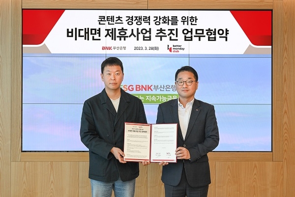BNK부산은행이 28일 오전 부산은행 본점에서 직장인 라이프스타일 플랫폼 운영사인 베러먼데이와 ‘콘텐츠 경쟁력 강화를 위한 업무협약’을 체결했다고 밝혔다.
