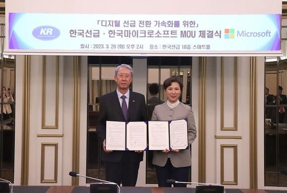 한국선급(KR)이 한국마이크로소프트와 함께 28일 KR 부산 본부에서 ‘디지털선급 전환 가속화를 위한 업무협약’을 체결했다고 밝혔다.