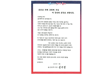 김두겸 시장은 서한문에서 “어려운 경영 여건에도 불구하고 사회적 약자를 위해 성금·성품 기탁, 저소득 아동 방과 후 학습 지원, 독거노인 김장 나누기, 집수리 자원봉사활동 등 크고 작은 지역사회 공헌 활동을 통해 나눔을 실천해 주셔서 깊은 감사의 말씀을 드립니다”라고 말했다.