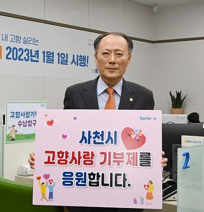 윤 의장은 29일 NH농협은행 사천시청출장소를 방문해 이웃 교류도시인 진주시에 고향사랑기부금 10만원을 보냈다.