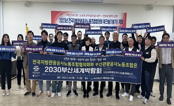 전국지방관광공사노동조합협의회(경기관광공사노동조합, 경상북도문화관광공사노동조합, 대전관광공사노동조합, 부산관광공사노동조합, 인천관광공사노동조합, 제주관광공사노동조합)와 부산관광공사가 지난 30일 부산에서 열린 ‘2023년 전국지방관광공사노동조합협의회 워크숍’에서 2030 부산월드엑스포 유치를 지지하고 함께 협력하기로 했다.