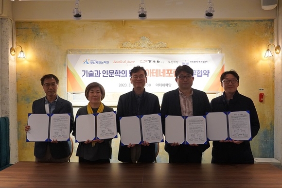 부산테크노파크(TP)가 지난달 31일 아테네학당에서 아테네학당, 부산학당, 백년어서원, 부산출판문화산업협회 5개 기관이 모여 ‘기술과 인문학의 만남 아테네포럼’ 업무협약식을 개최했다고 밝혔다.