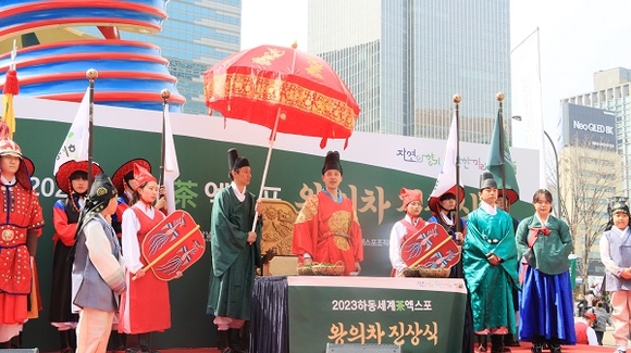 하동세계차엑스포 조직위원회는 엑스포 사전 붐 업 행사로 지난 1일 서울 청계광장에서 조선 시대 임금님에게 지리산 명품 하동 차(茶)를 올리는 '왕의 차 진상식'을 개최했다.