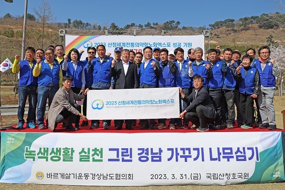 경남 산청군이 '2023산청세계전통의약항노화엑스포' 나무를 심으며 엑스포 성공 개최를 기원했다.
