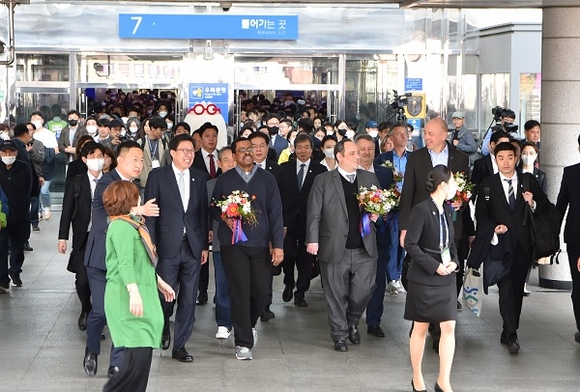 박형준 시장은 오전 국제박람회기구 실사단을 맞이하는 ‘부산역 시민환영행사’를 마치고 오후에는 북항과 부산시민공원, 해운대수목원을 찾았다.