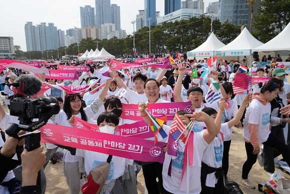 하윤수 부산시교육감이 4일 오후 4시 해운대 해수욕장과 동백섬 일대에서 초·중·고 학생, 학부모, 교직원 등 3000여 명을 대상으로 2030 월드엑스포 유치 기원 ‘교육공동체 한마당 걷기대회’를 개최했다.