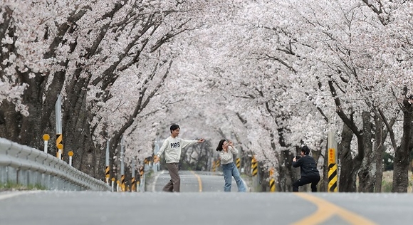 4일 경남 함양군 백전면 50리 벚꽃길에서 주민들이 활짝 핀 왕벚꽃을 감상하며 즐기고 있다. 이곳 백전면 다목적광장 일원에서는 오는 8일부터 9일까지 이틀간 제21회 함양 백운산 벚꽃축제가 다양하게 열린다. (사진=함양군 제공)