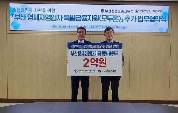 부산신용보증재단이 5일 오후 재단 본점에서 부산시, BNK부산은행, 부산형사회연대기금과 청년창업자 지원을 위한 ‘부산 영세자영업자 특별금융지원(모두론) 협약보증’ 업무협약을 체결했다.