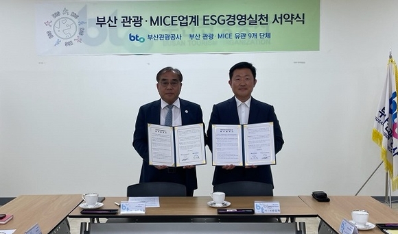 협약서에는 ▲ 관광·마이스업계 ESG 경영 도입 및 지원 ▲ 부산지역 지속 가능한 ESG 행사 가이드라인 적용 노력 ▲ 친환경 관광명소 조성 및 지속 가능한 관광콘텐츠 개발 공동협력 ▲2030 부산세계박람회 유치 등 대형 행사 유치 공동 노력 등에 대해 협력하기로 합의했다.