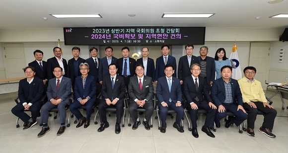 지난달 28일 발표된 정부의 '2024년도 예산안 편성지침'에서 내년도에도 정부의 건전재정기조가 계속될 것으로 전망됨에 따라 국비 확보가 여의치 않은 상황임을 공감하고 지역 국회의원들과 함께 내년도 중점 국비확보 사업과 현안사업의 해결 방안을 심도 있게 논의했다.