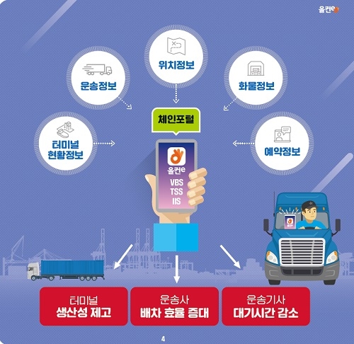 ‘올컨e’는 터미널 생산성 향상, 배차 효율 증대, 터미널 내 차량 대기시간 감소를 목적으로 구축된 모바일앱으로 ▲항만트럭예약시스템(Vehicle Booking System), ▲환적운송시스템(Trans-shipment Shuttle System), ▲통합정보조회서비스(Integrated Information Service) 등 운송기사의 편의를 위한 서비스를 제공하고 있다.