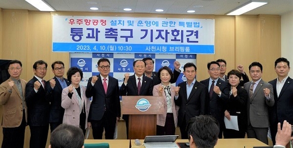 사천시의회가 10일 오전 시청 2층 브리핑룸에서 의장을 비롯한 12명의 시의원 전원이 참석한 가운데 기자회견을 갖고 '우주항공청 설치와 운영에 관한 특별법'의 국회 통과를 촉구했다.