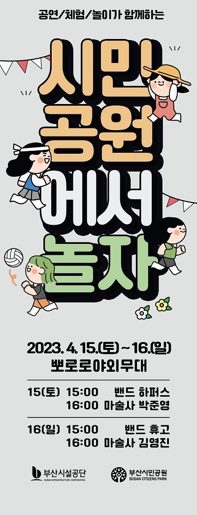 부산시설공단이 오는 15~16일 봄을 맞이해 부산시민공원 일원에서 공연, 체험, 놀이가 함께하는 문화행사 ‘시민공원에서 놀자’를 개최한다고 밝혔다.