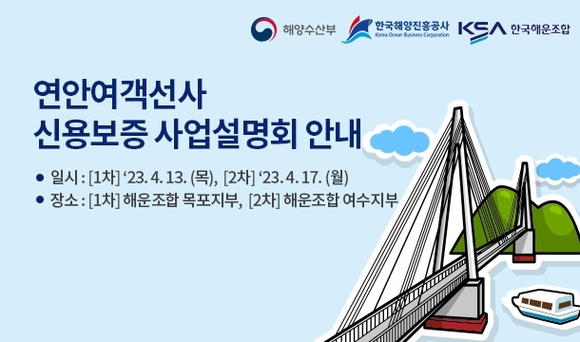 한국해양진흥공사가 연안여객선사를 대상으로 오는 13일 14시 해운조합 목포지부, 17일 14시 해운조합 여수지부에서 ‘연안여객선사 신용보증 사업설명회’를 개최한다고 밝혔다.
