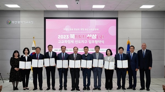 시교육청은 11일 오후 3시 시교육청 별관 국제회의실에서 지자체, 대학, 유관기관 등 9개 기관과 북구·사상구 고교학점제 선도지구 ‘북적북적 상상나래’ 운영을 위한 업무협약을 체결했다.