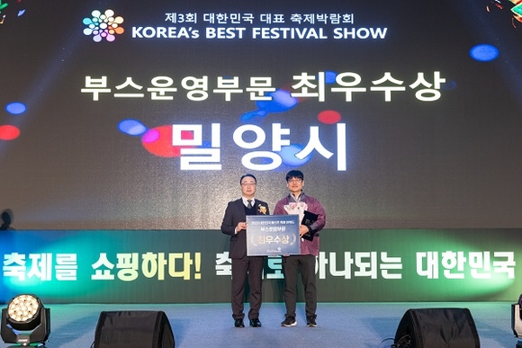 경남 밀양시는 지난 7일부터 9일까지 부산 벡스코에서 열린 제3회 대한민국 대표 축제박람회에서 부스 운영 부문 '최우수상'을 수상했다고 11일 밝혔다.