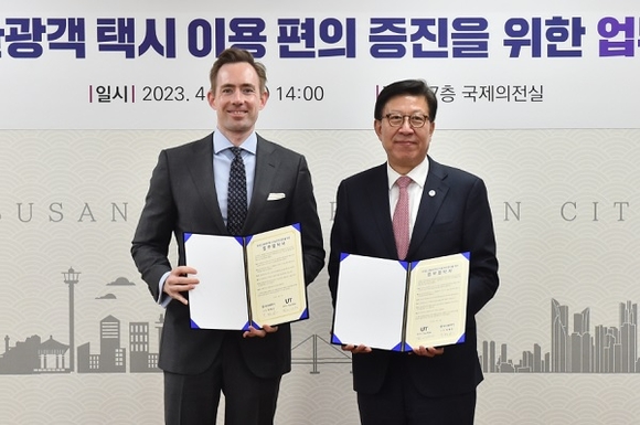 부산시가 12일 오후 2시 시청 국제의전실에서 외국인 관광객 택시 이용 편의 증진을 위한 업무협약을 글로벌 혁신 기술 기업 ‘우버’와 ‘티맵모빌리티’의 합작회사인 ‘우티(UT)’와 체결했고 밝혔다.