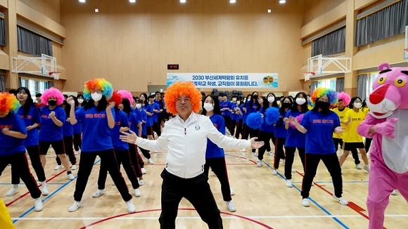 하윤수 부산시교육감이 13일 오전 8시 30분 금곡중학교 빛여울관에 방문해 학생들과 아침체인지(體仁智) 활동을 함께했다.